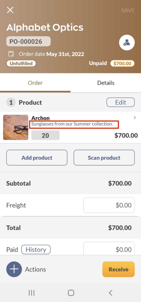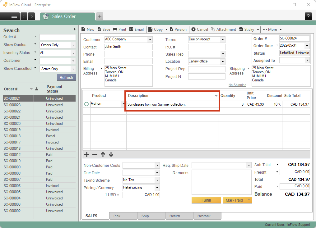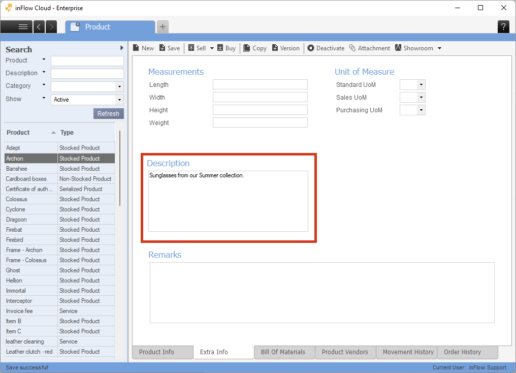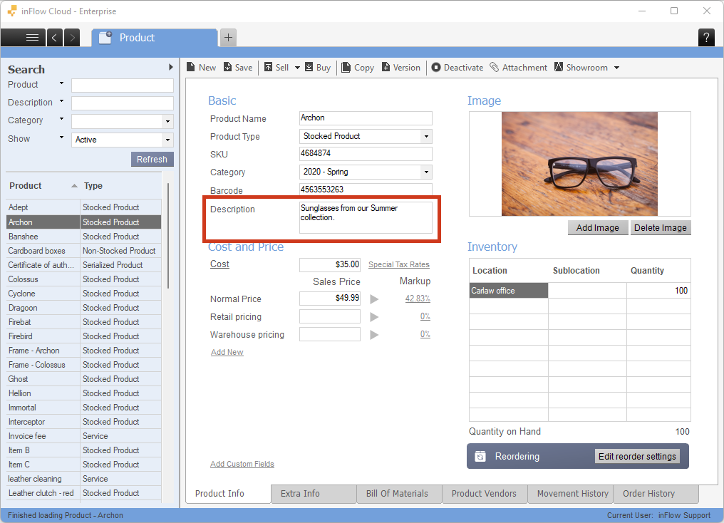 When the Product name and description are active in inFlow, the product record on the inFlow Inventory Web app doesn’t change. See below for where to enter the description.