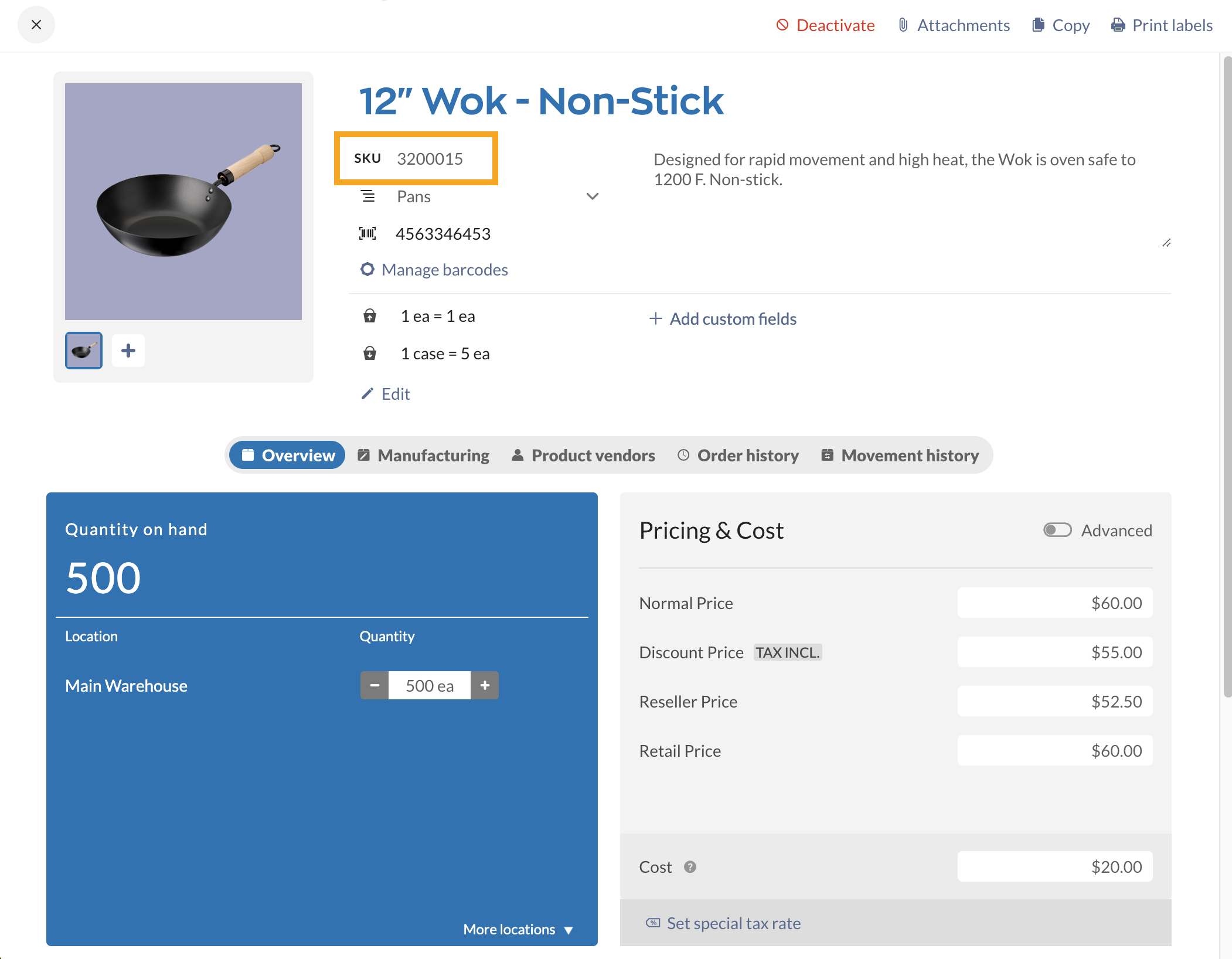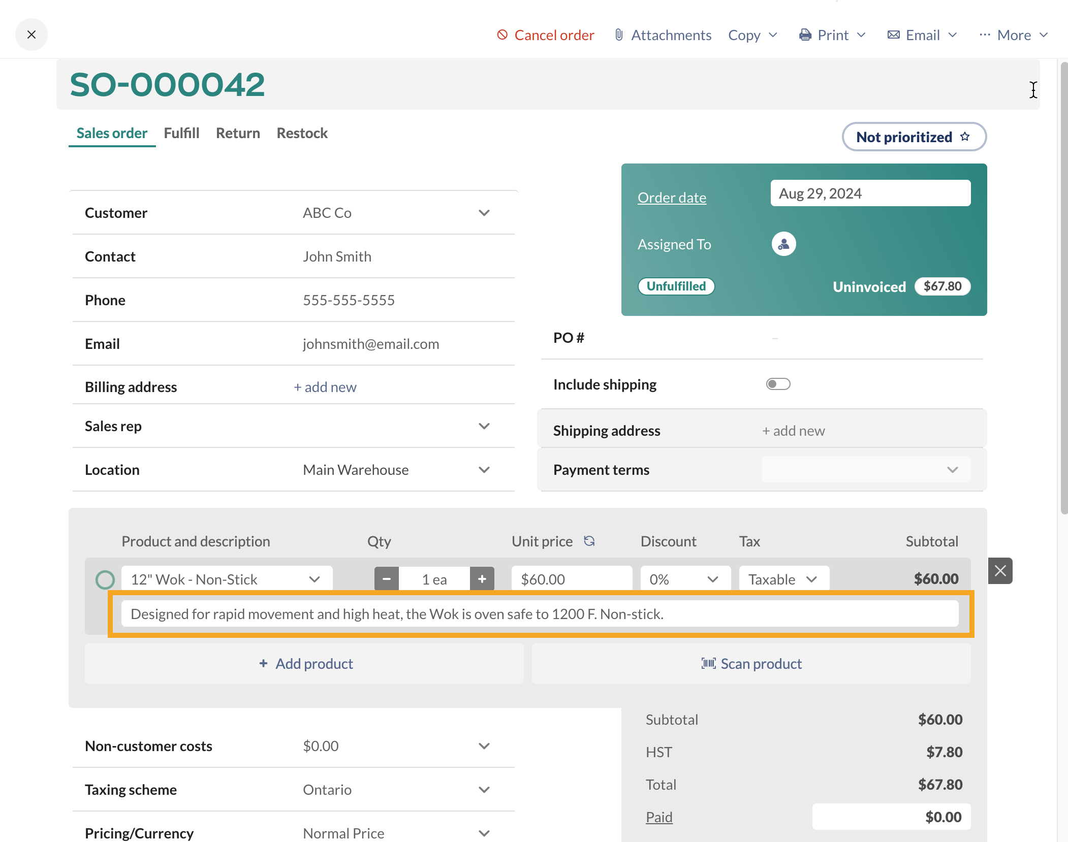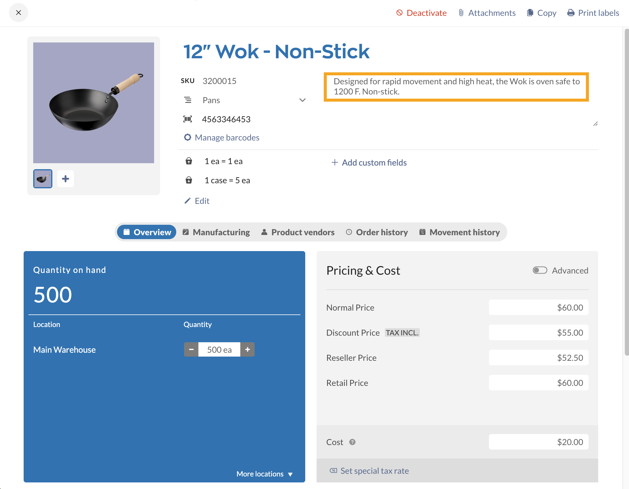 When the Product name and description are active in inFlow, the product record on the inFlow Inventory Web app doesn’t change. See below for where to enter the description.