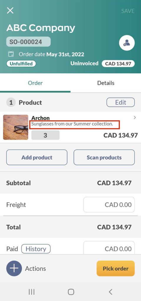On orders, the description is listed under the product name.