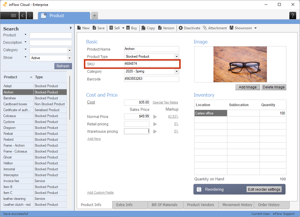 With the product name and description option active, the Description is listed on the Product Info tab under the barcode field. You can still enter an SKU on the product record. It just won’t be displayed on orders.