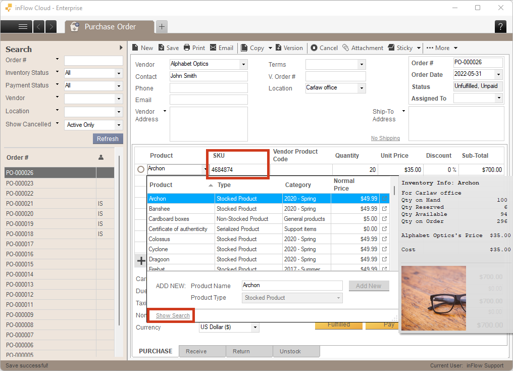 By default, the program will display the “Product name and SKU” field. If you want to search by the SKU, you can do that by clicking on the Show Search button and selecting the SKU filter.