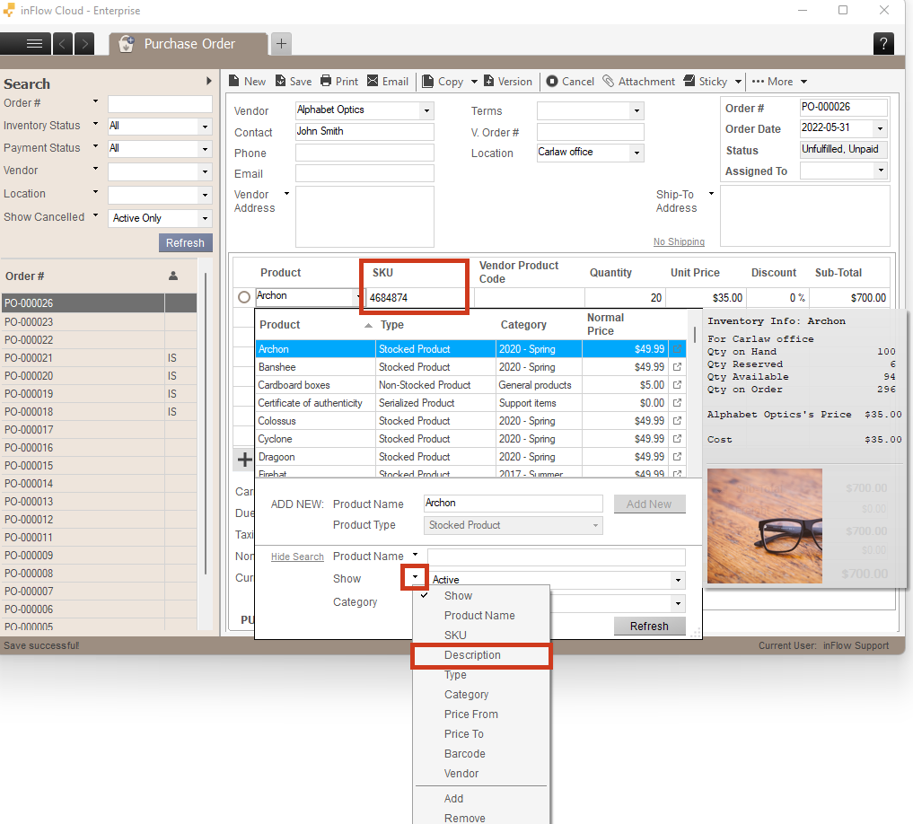 If you choose to display “Product name and description,” the order will display the Description on your orders. If you want to search by the SKU, you can do that by clicking on the Show Search button and selecting the SKU filter.