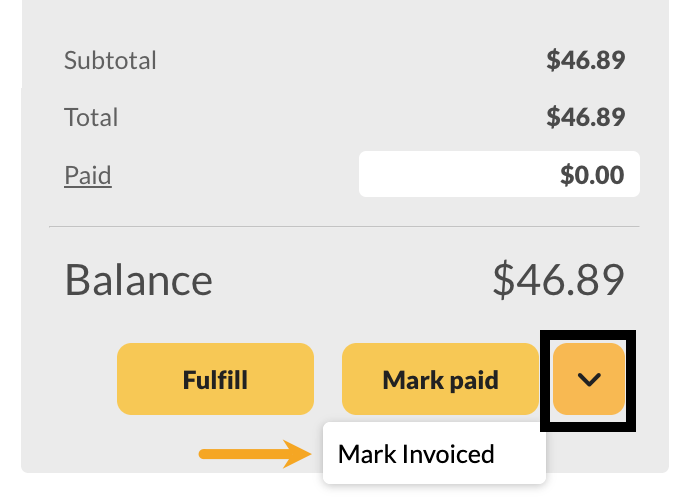 If you want to mark the order as invoiced but don’t need to print or email it, you can click on the down arrow next to Mark paid to select Mark Invoiced.