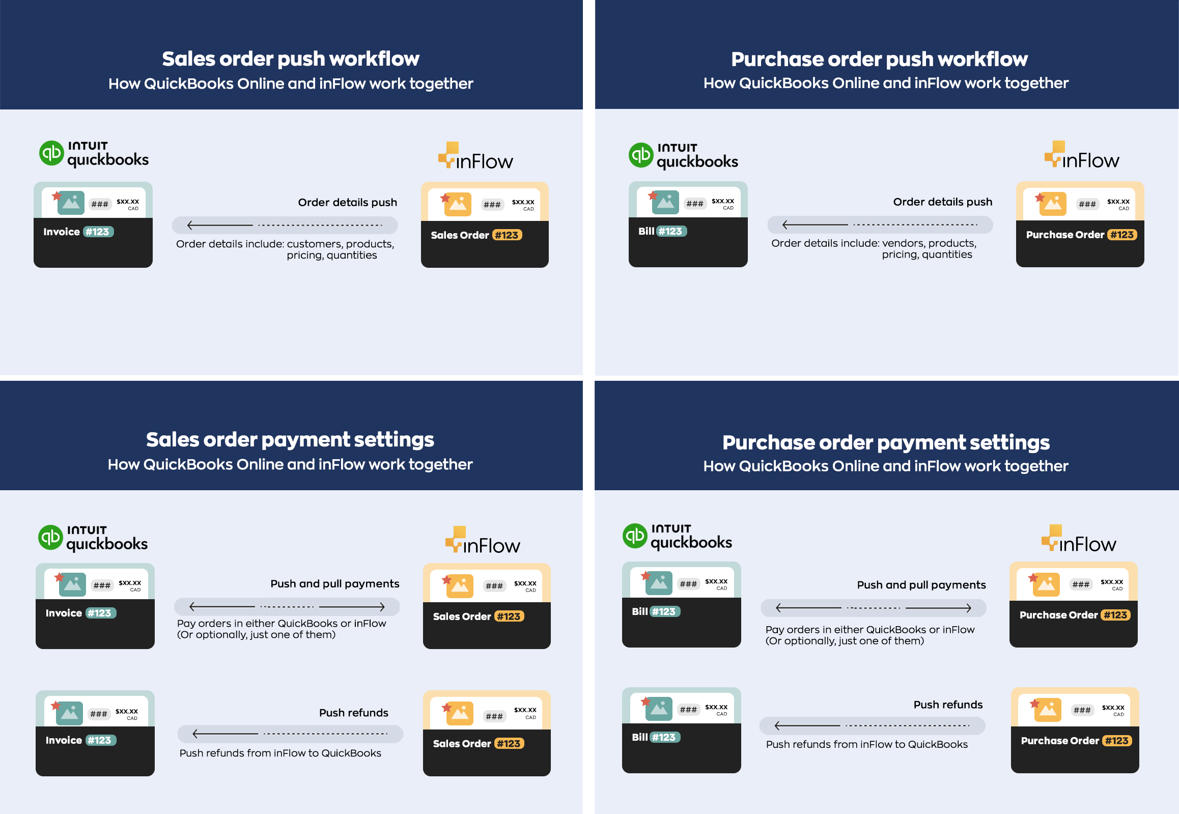 | Push and pull payments | This is a two-way payment sync option, where you can enter payments in either inFlow or QuickBooks Online. Please note: The two-way sync feature is strictly for payment information. This integration does not support two-way order sync. Orders must be created in inFlow first. This setting is recommended if your team would like to process payments using either software, and the information will be sent automatically to the other one. If a payment is added to a QuickBooks Online bill/expense, the payment will be sent to the matching inFlow purchase order. If a payment has been added to the inFlow purchase order, that payment will be sent to the matching QuickBooks Online invoice. |