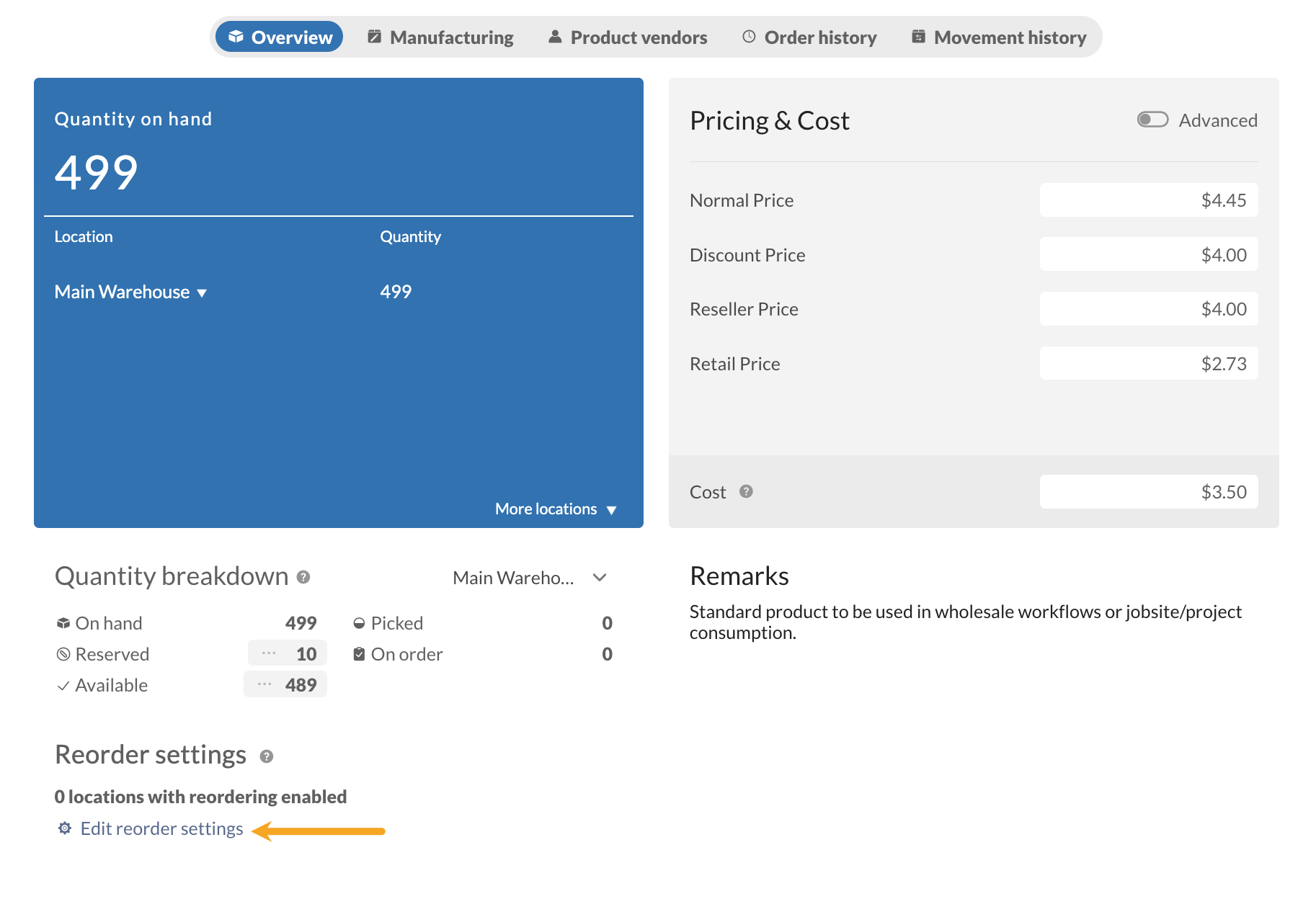 Use inFlow’s product reordering settings to keep your inventory organized and ensure you always have enough stock.