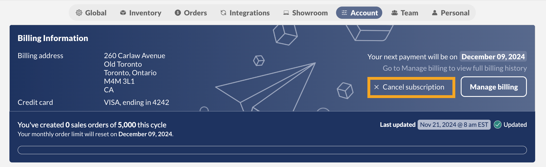 2. Click on Cancel subscription (next to the Manage billing button.)