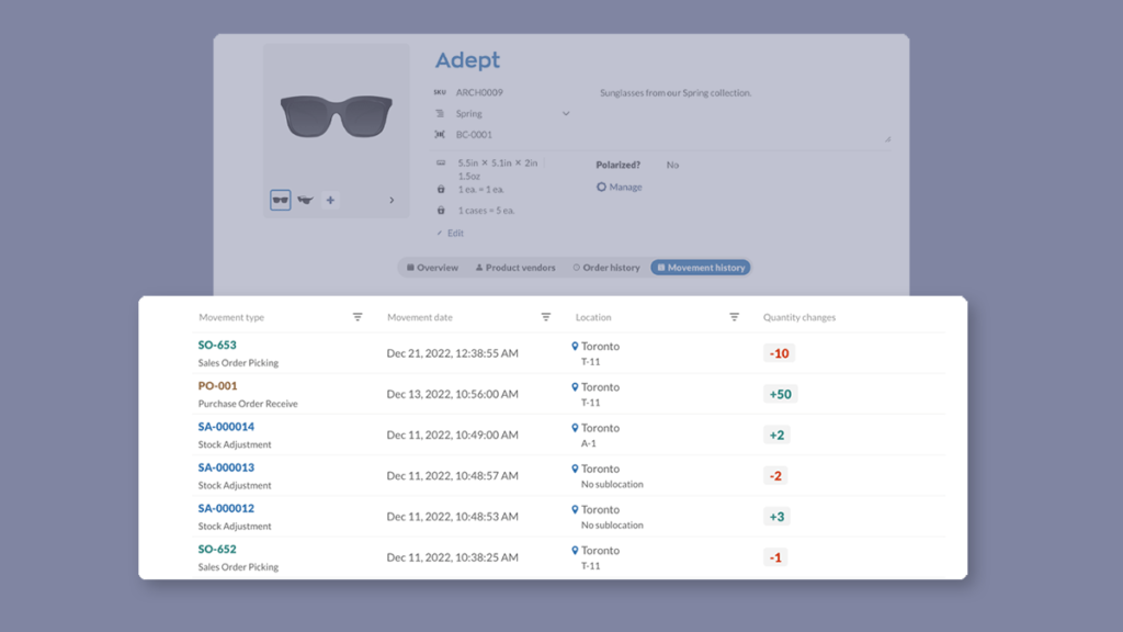 This is helpful for quickly auditing stock levels, since you can pinpoint questions like how many times was this product’s stock adjusted in the past month in Toronto?