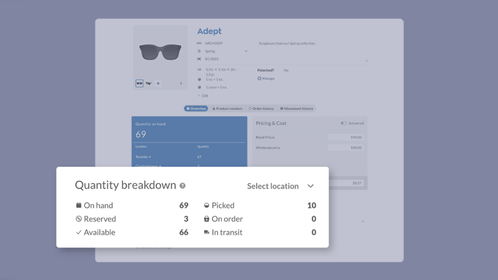 That’s why the updated product record screen has a new Quantity Breakdown section, which you can filter by location. So if you want to know how much of that product is on order in Charlottetown, you can find out in real-time, and without having to run a report.