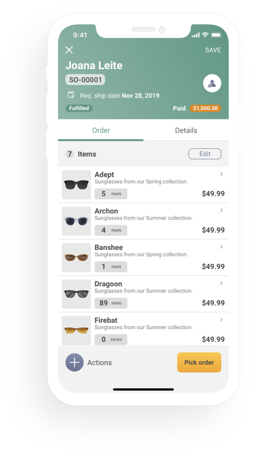 You can create, send, or share orders; manage your products including barcodes and photos; do stock transfers and adjustments; and perform mobile picking and receiving.